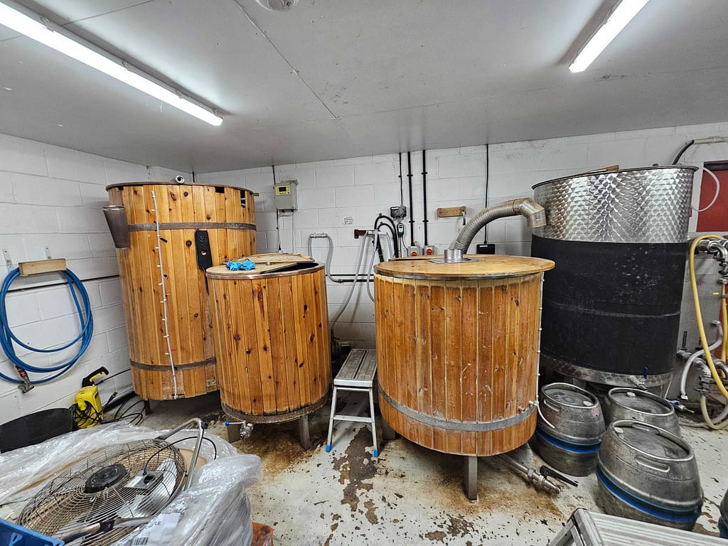 We were then taken on a quick tour of the brewery. It’s a tight space, dominated by fermentation tanks, with the brewhouse itself tucked in at the back. We got a peek into one of the tanks that had been dry-hopped that morning — the aroma was incredible. Fermentation is done openly here; the tanks have lids, but they’re loose-fitting. Once the beer reaches terminal gravity, it’s cold-crashed and packaged for final conditioning in cask.