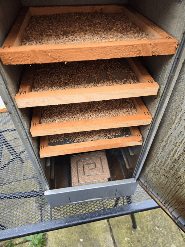 Next up you will require something to burn the wood dust in. Spiral wood burners come in a variety of shapes, but most are square and, when filled with wood dust allow a controlled “burn” over several hours. The spiral maze-like layout and the mesh walls between the spirals ensures that the wood burns slowly in a controlled manner, rather than just in one great pyre. You do have to exercise a little bit of caution so as not to overfill the smoking tray above the wire walls, as this will allow “fire” to jump across the spirals, rather than be directed round the “maze”. In the image below you can see the spiral smoker, along with four trays of malt which has been very thinly spread…. the ProQ cabinet can take up to 7 shelves if necessary.